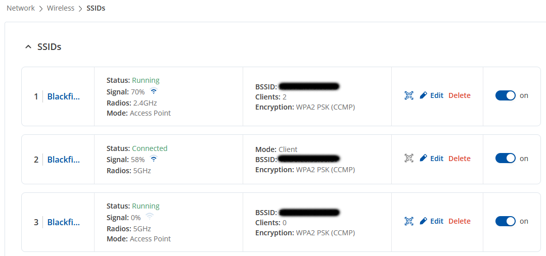 I have defined two access points with different SSIDs for 2.4 GHz and 5 GHz Wi-Fi and a third one as client to connect to a Starlink antenna on 5 GHz.
