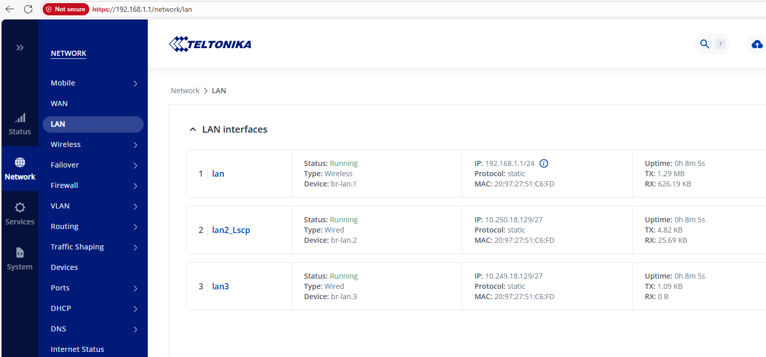I have a RUTM51, and I’ve configured two VRFs: one for MGMT and one for DATA. My question is: can I access the Teltonika web interface via the MGMT VLAN interface (SVI)? Currently, I’m managing the device through 192.168.1.1, but whenever I try to access it via the MGMT VLAN interface, I can’t connect using HTTP, HTTPS, or SSH.