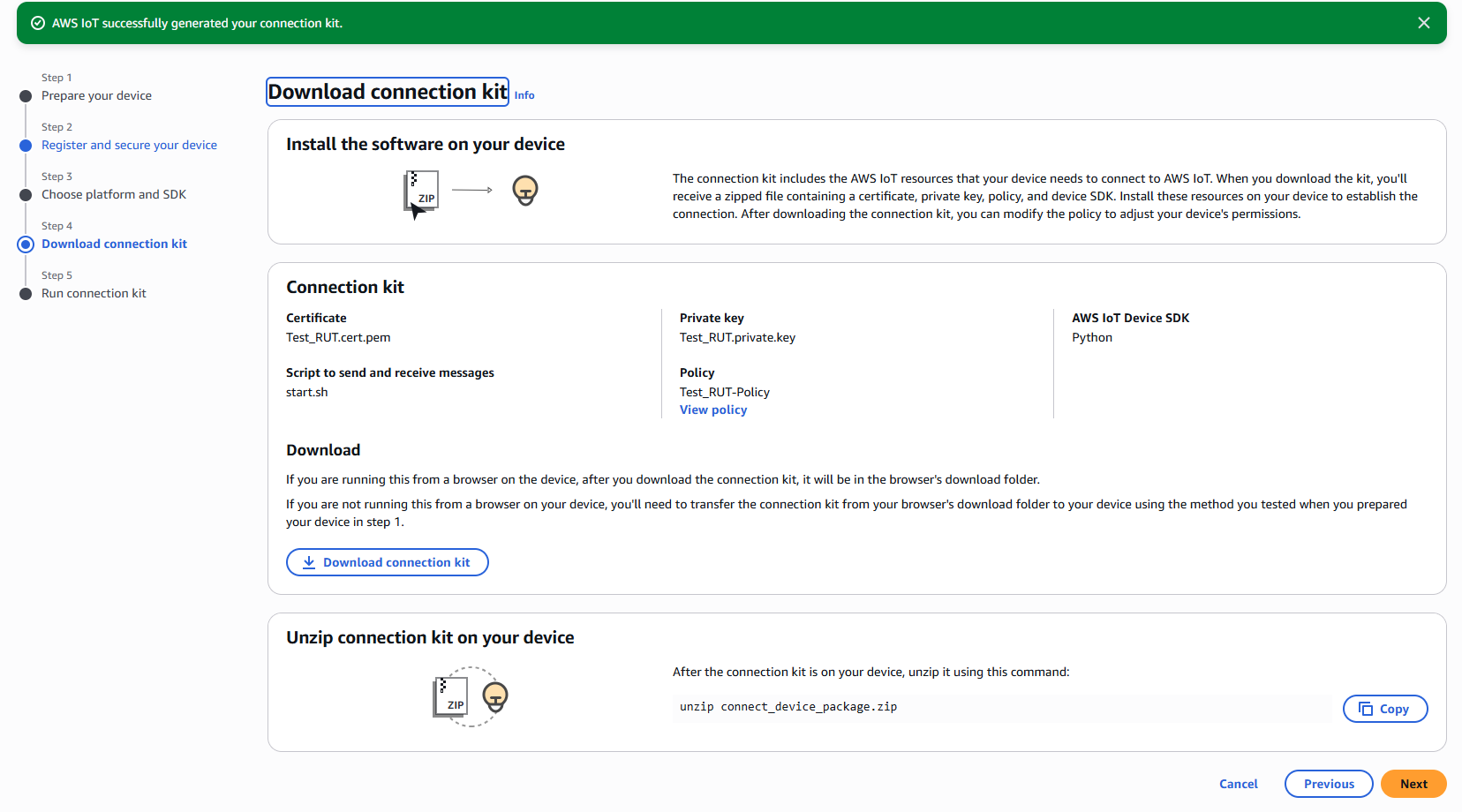 The AWS test facility instructs to download the package file to the device and to run the .sh file to be able to prove an MQTT connection to AWS. Part of the connection kit build is to tell AWS key things such as the device platform (Linux) and SDK (python). Once the kit is installed it instructs to run the following two commands ‘chmod +x start.sh’ and ‘ ./start.sh’ which should then return some message from the RUT241 which can be seen in AWS.