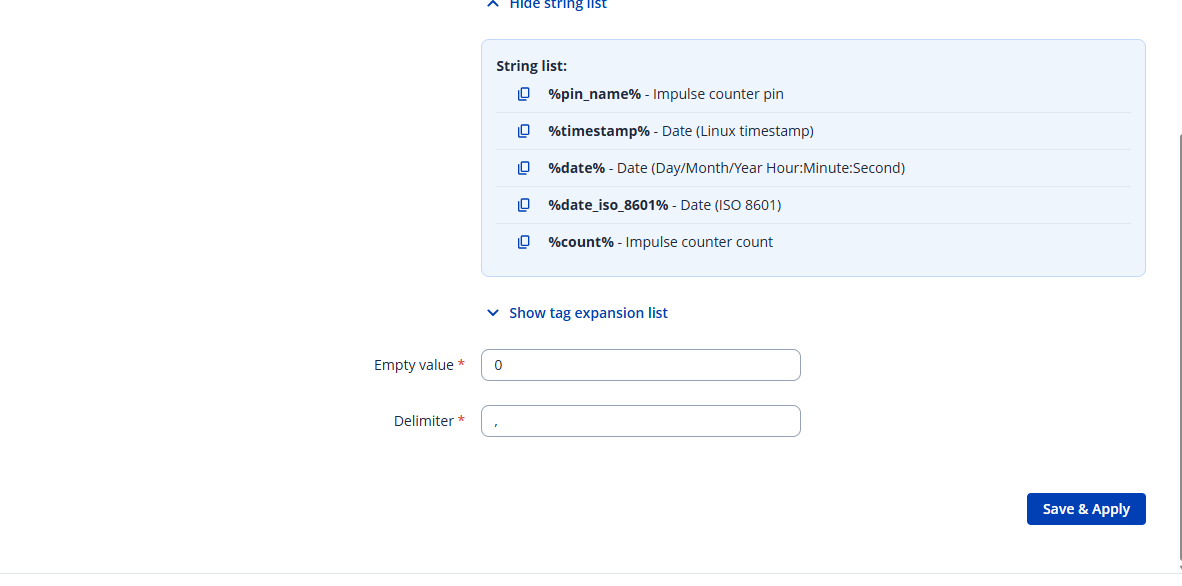 If no pulses are detected, no entry is created in the database, meaning the impulse counter data isn’t sent. A workaround would be to use a Lua script. Within the script, you can pull the impulse counter values (via API or by getting data straight from the database) and add logic to send a “0” when no impulses are recorded.