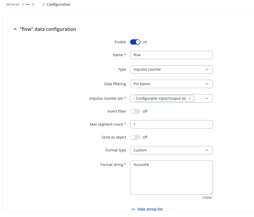 Hi, I am using the device TRB140. I am using the Impulse Counter service. It is working fine. I am also using the Data to Server service to send the count to an external MQTT broker. It is working fine. However, when the count does not change I do not receive a message that notifies of such zero. This is a problem, because I have a synoptic that every minute must update the state. If no counts happened then the synoptic must show that. However, given that only positive counts are sent, my synoptic keeps the state of the last non-zero value.