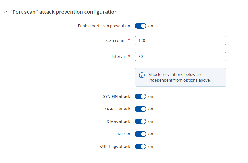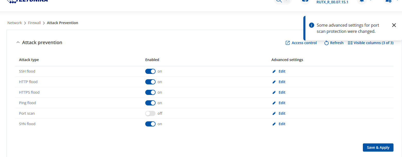 I am trying to activate the Port scan prevention feature on a RUTX10 running RutOS with firmware RUTX_R_00.07.15. I go to Network > Firewall > Attack Prevention and click to activate the Port scan feature. However when I click “Save & Apply” the setting is turned “off” again automatically. Scan count = 120 and interval = 60, as per default. What am I doing wrong? How can it be enabled?