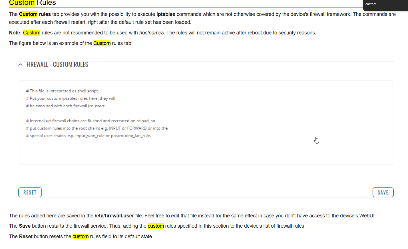 Rutx11 wiki told the custom rules are located in /etc/firewall. user file. In my Rutx11, I cannot find in question file /etc under the directory. Has the file location changed in a firmware version or are the instructions outdated?