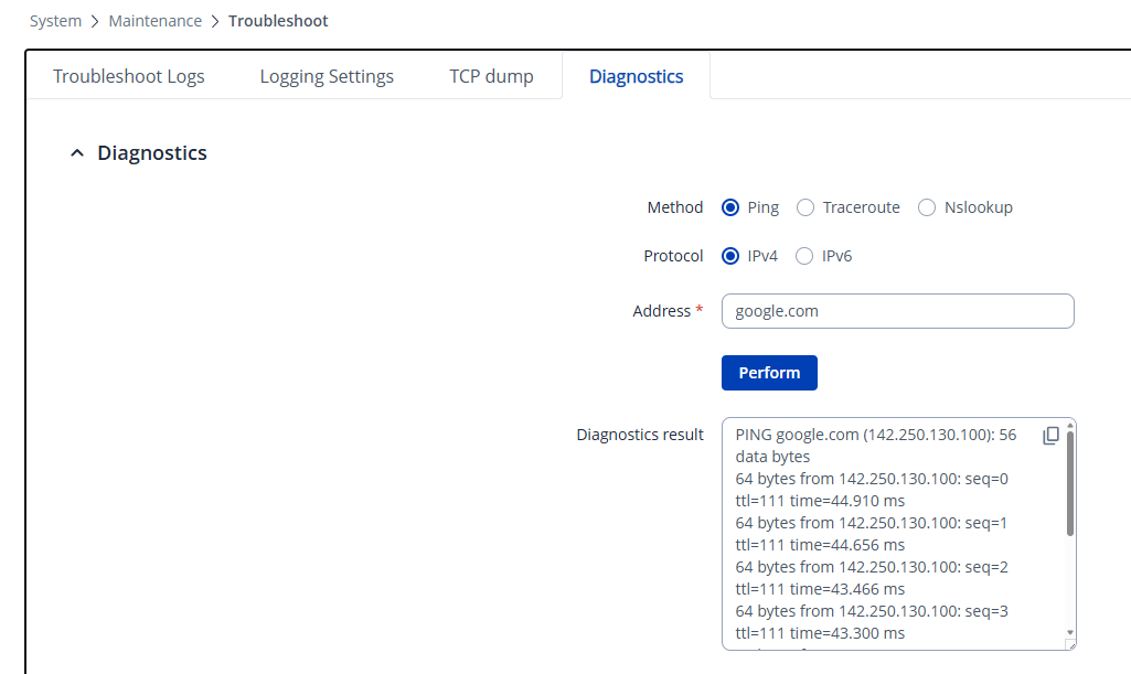 Next, go to System → Maintenance → Troubleshoot → Diagnostics and try the following: