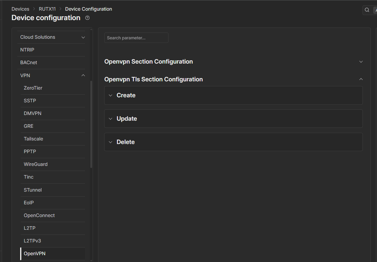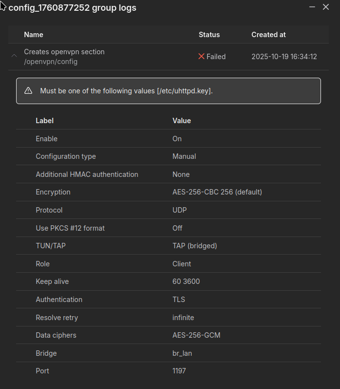 I am trying to configure an OpenVPN connection on a RUTX8 (Firmware 7.17.5) via RMS. This has worked some times yesterday, but I had to go through repeated revolutions while finding out which settings to do to make the tunnel work with my remote. Today, I cannot configure the router with the RMS any more. The connection first times out, and then the configuration fails with “Must be one of the following values [/etc/uhttpd.key]” without any more explanation.