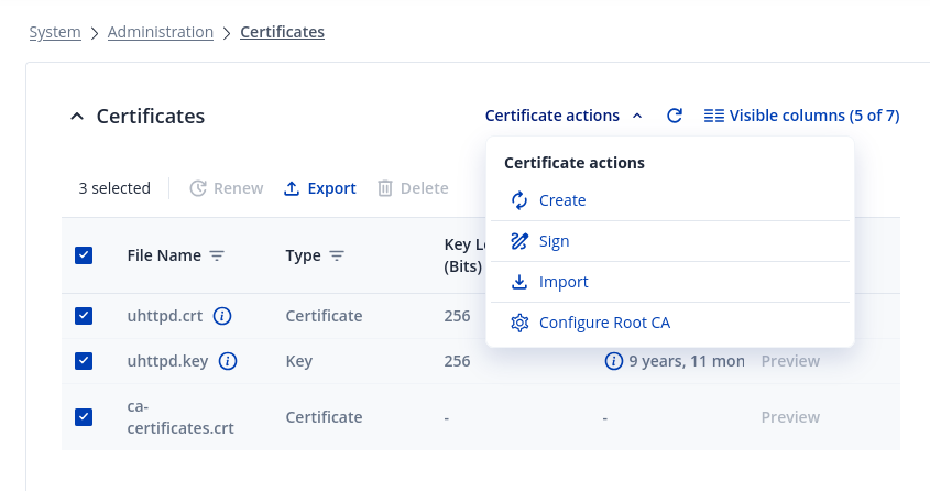 You can create or import certificates in System → Administration → Certificates by pressing the Create or Import button. Detailed instructions on how to generate or manage certificates can be found here:
