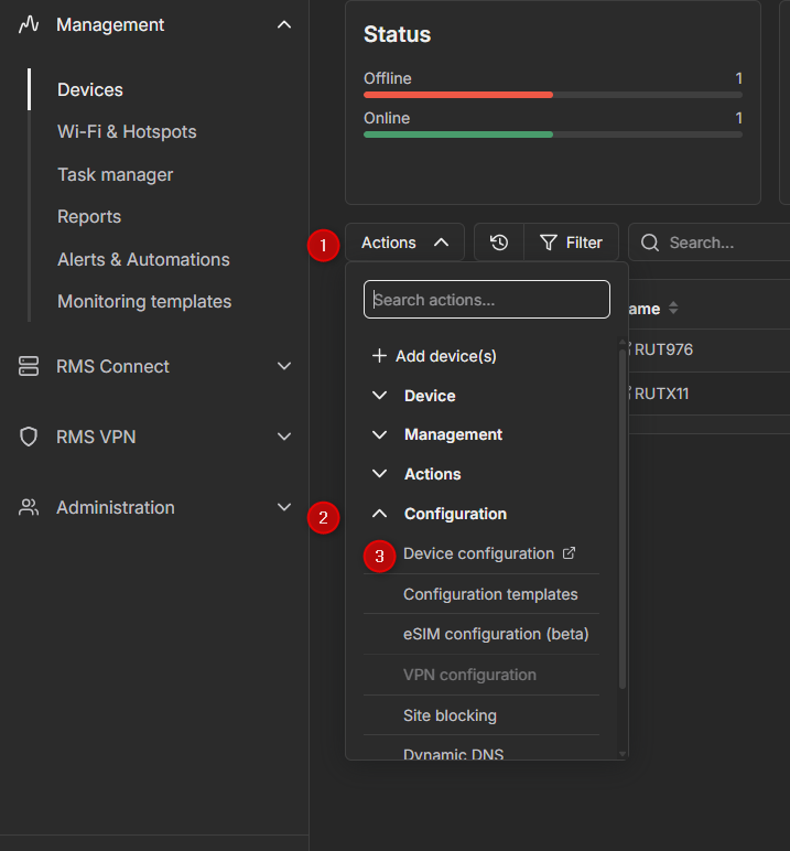 To do so, select the device in RMS, then go to Actions → Configuration → Device Configuration. This will open a page where you can view and edit the device’s configuration remotely.