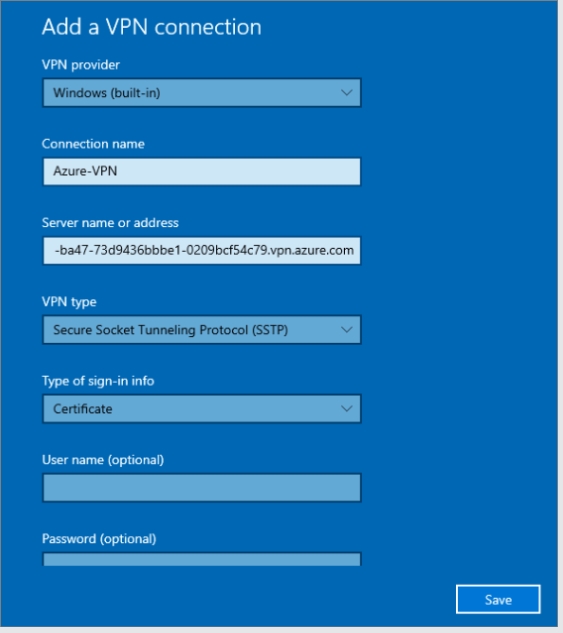 Regarding the server address specification, I assume the RUT SSTP client can’t handle the extended Azure URL format. Instead, could you try using the Azure VPN Gateway’s public IP address? I believe you can find this address in the Azure portal under your Virtual Network Gateway settings.