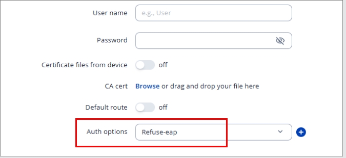 Since you’ve configured Azure to use certificate authentication only (the SSL option), the refuse-mschap setting won’t apply here because that is meant for username/password authentication. In your case, you should select refuse-eap, which instructs the client to use certificate-based authentication instead of username/password or EAP methods.