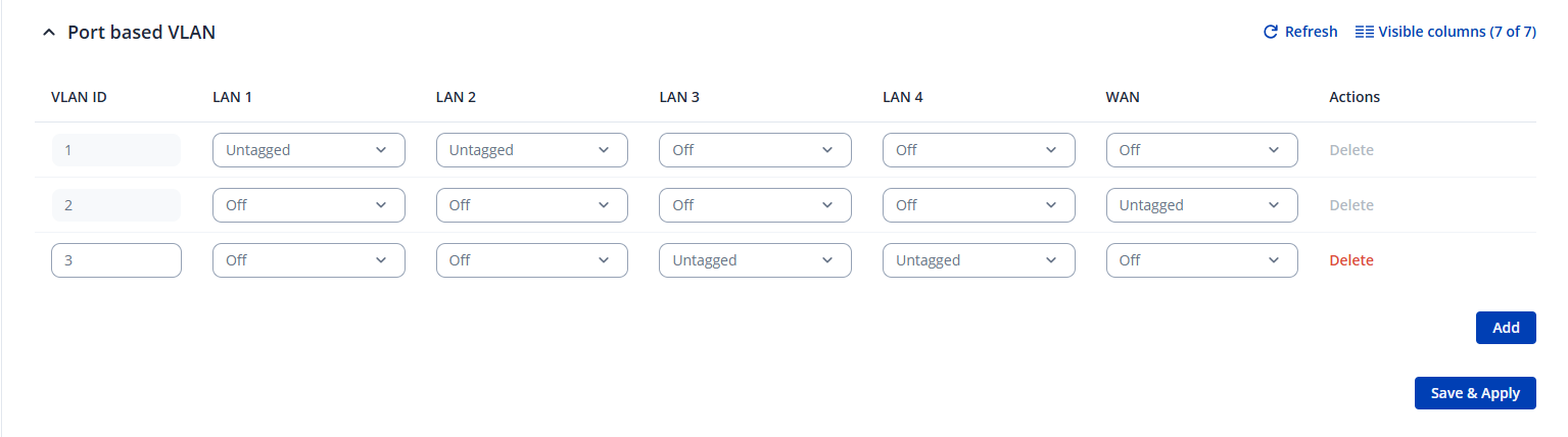 Then you need to create a VLAN on the Master (for this example, we’ll use Port-Based VLANs), navigate to Network → VLAN → Port Based, click Add, and select the ports that should belong to the 192.168.3.0 subnet as Untagged.
