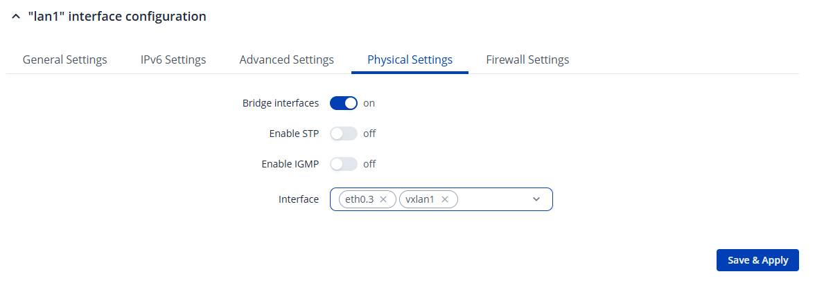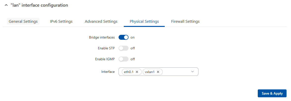 Now we need to apply the VXLAN, on the master device go to Network → LAN, select the newly created, go to physical settings and add the vxlan interface.