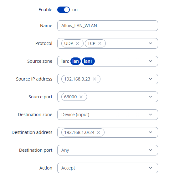 To isolate the WLAN and LAN networks and only allow traffic from 192.168.3.23 to the 192.168.1.0 subnet on port 63000, create specific firewall rules on both devices (same 4 rules on both devices).