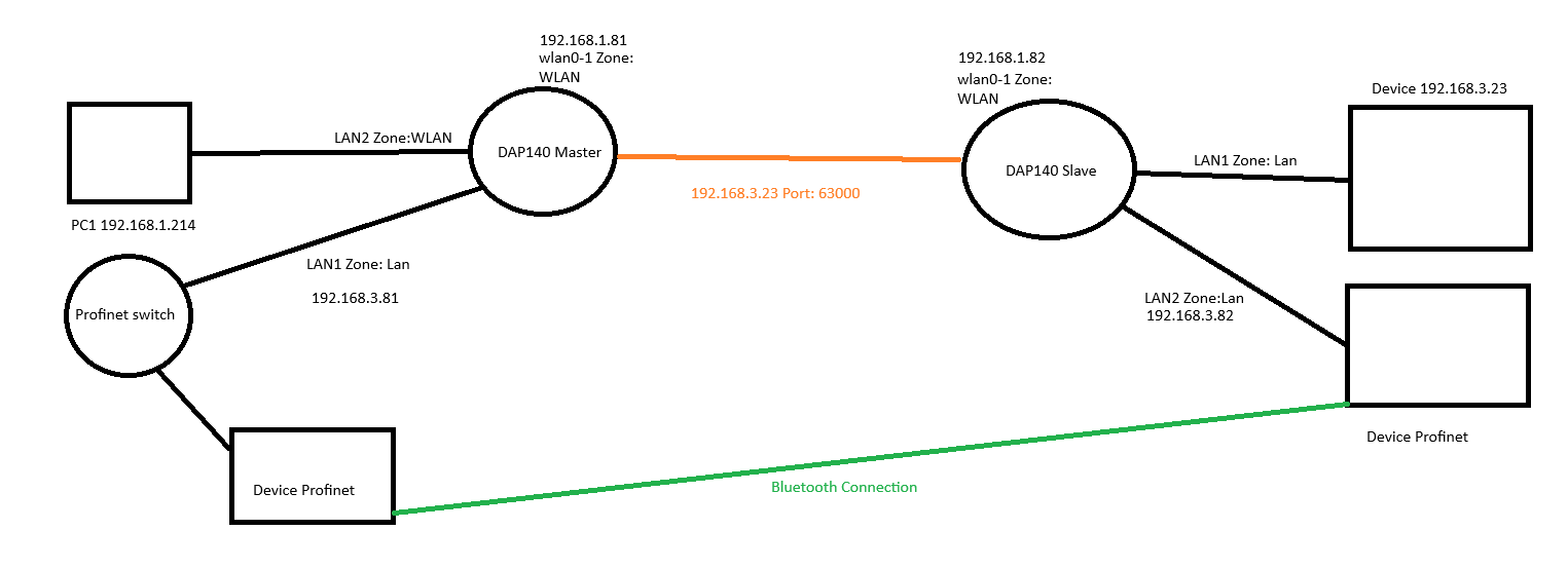 You have two DAP140 devices — one configured as a WiFi access point (Master) and the other as a client (Slave) connected to it. Your goal is to enable Layer 2 communication within the 192.168.3.0 subnet, while allowing only the device with IP 192.168.3.23 to access the 192.168.1.0 subnet through port 63000.