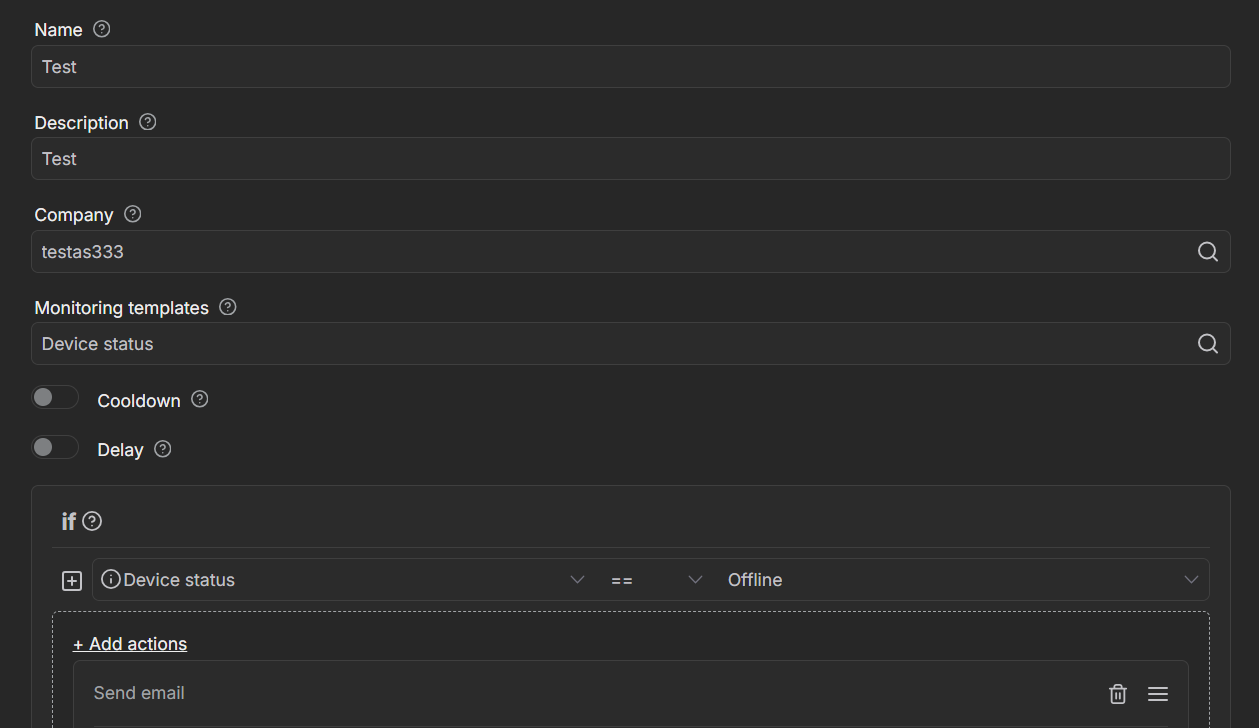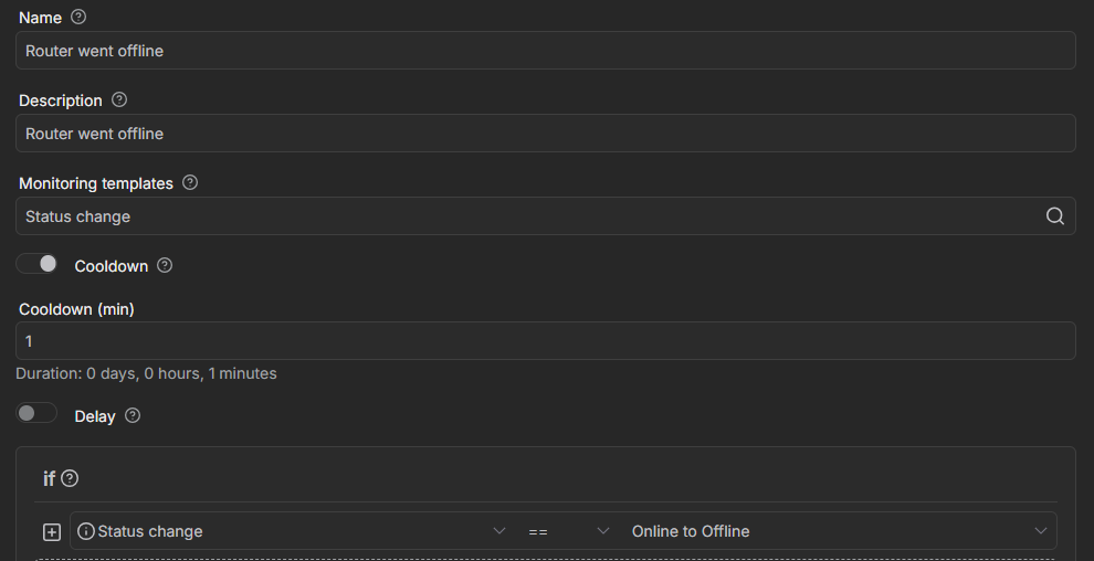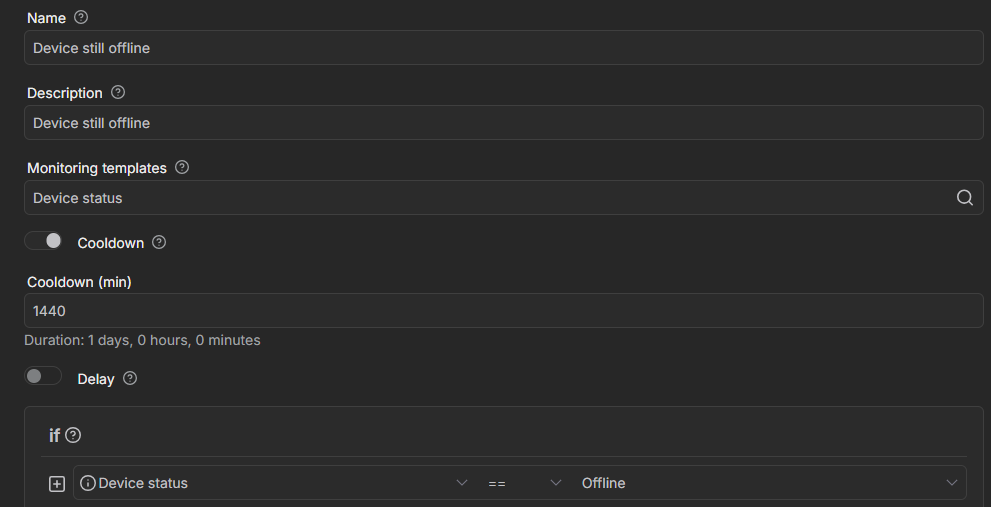 My goal is to receive an email when a device remains offline for example 1 hour. After that I want to receive an email for example every 1 day if the device is still offline.
