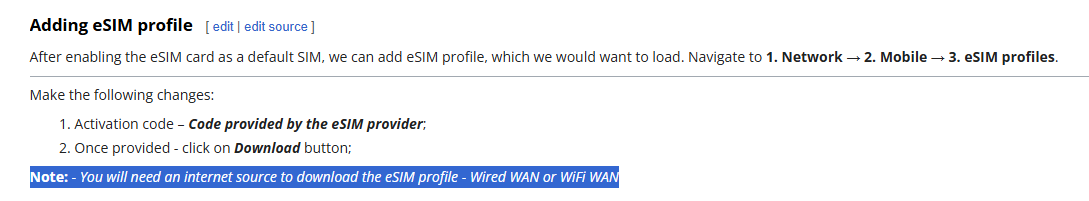 Since Teltonika’s own documenation makes NO MENTION of the absolute requirement for WAN Ethernet connection (ESIM Configuration example - Teltonika Networks Wiki - as of 2025-07-23) to activate an eSIM on a single-modem device, this forum is filling up with frustrrated engineers asking questions about eSIM activation! Question 1: Would Teltonika staff please comment here to either correct me are verify my claims? Question 2: Do Teltonika have any plans to mimic other manufacturers such as Mikrotik, to make the eSIM “download” process simpler?