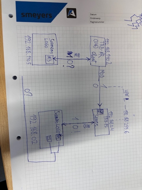 More or less, from what I’ve understood, currently - TRB no. 1 reads a value from a device called “Logo-NR” (? what device is it) → Sends a Modbus write request over the VPN Hub to TRB no. 2 to toggle an output. To the output, there’s another device connected (?) which activates M4 (? is it another device? is it the name of an input/output?)
