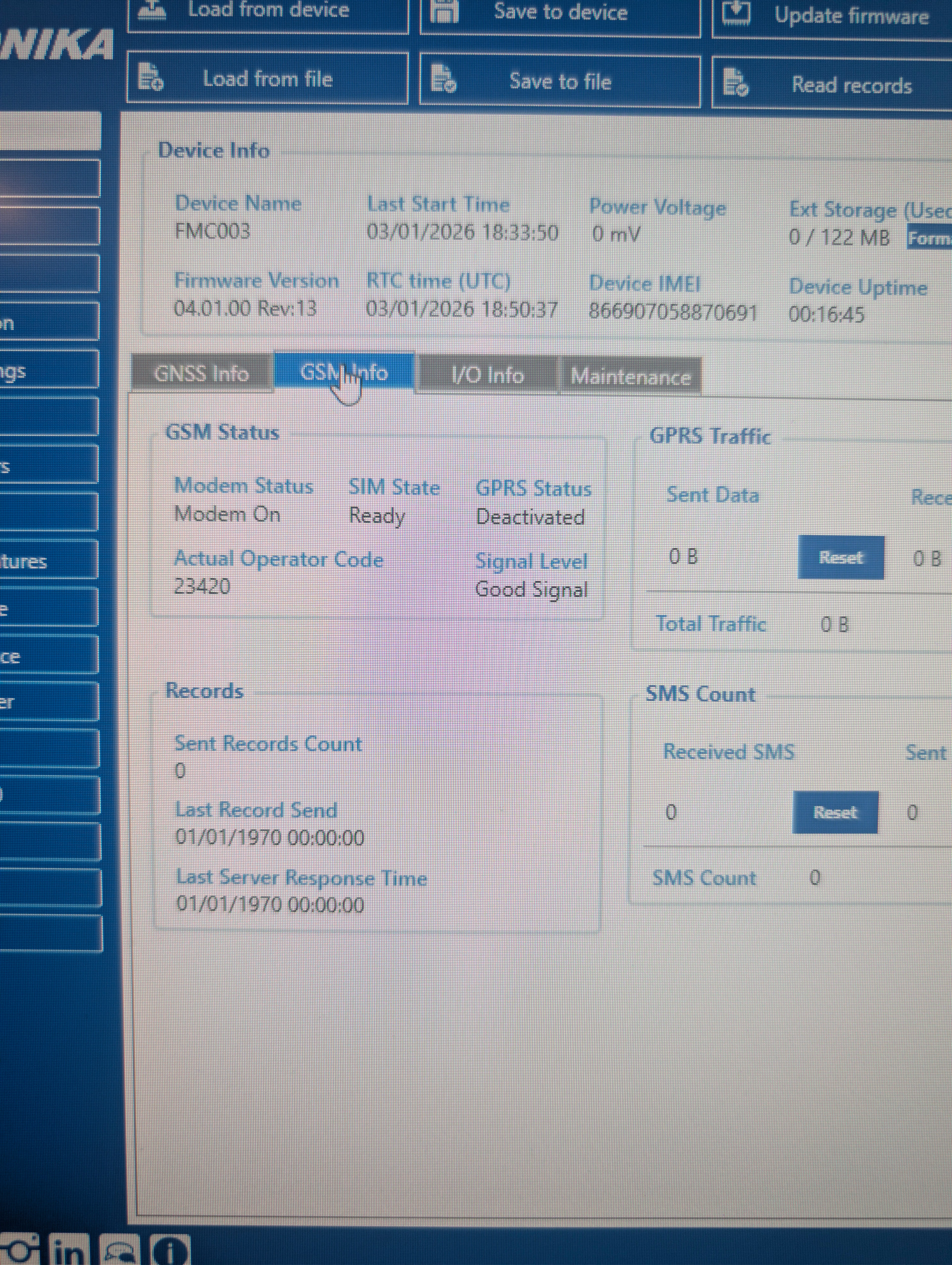 My device FMC003 does not work in a reliable way. One week ago it worked, and today I spent one hour to make it work (GPRS Status stays deactivated as in the other thread (“FMC003 does save records but does not send them”). So it is quite annoying to start a development. Are there any news regarding this issue on Teltonika side ?