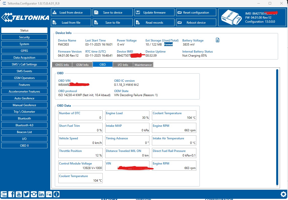 Currently, I only receive basic data such as ACC status and speed, but no detailed OBD information. When I connect to the FMC003 via Bluetooth, I can confirm that OBD data is being read correctly — however, it isn’t being transmitted to Traccar.