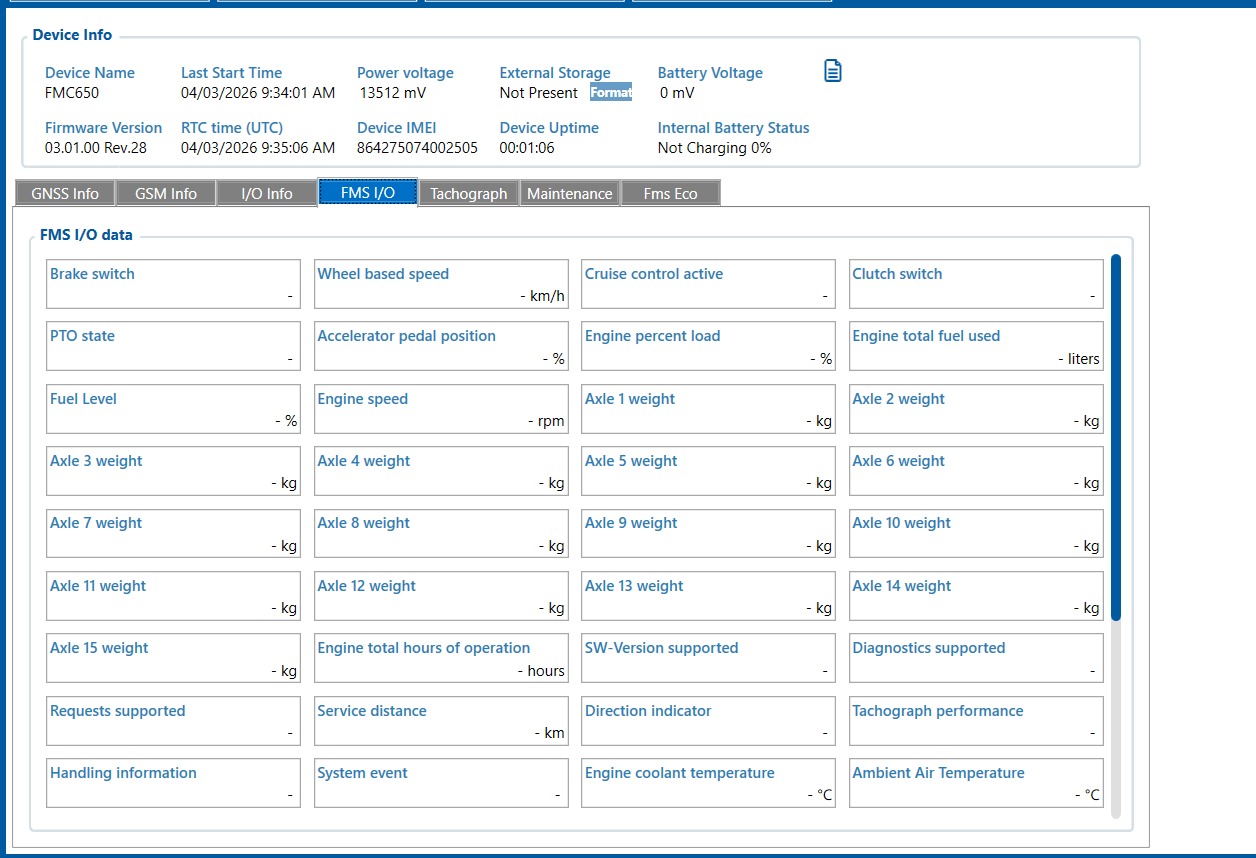What is the functional difference between “FMS I/O” and “CAN Adaptor” in Teltonika devices? - FMS I/O and CAN Adapter Tabs could only be found on FMX650. Data transmitted on its Built-in CAN would appear on FMS I/O while data retrieve using external CAN Adapter such as LVCAN200 and ALLCAN300 would appear on CAN Adapter. FMC130 which does not have a Built-in CAN would receive CAN parameters using the CAN Adapter tab.