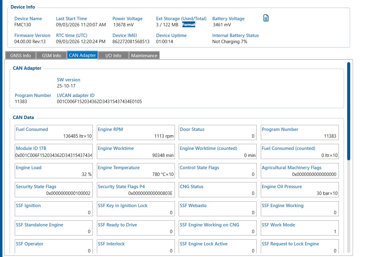 We are working with two Teltonika tracker models: FMC130 with LV-CAN adaptor and FMC650.