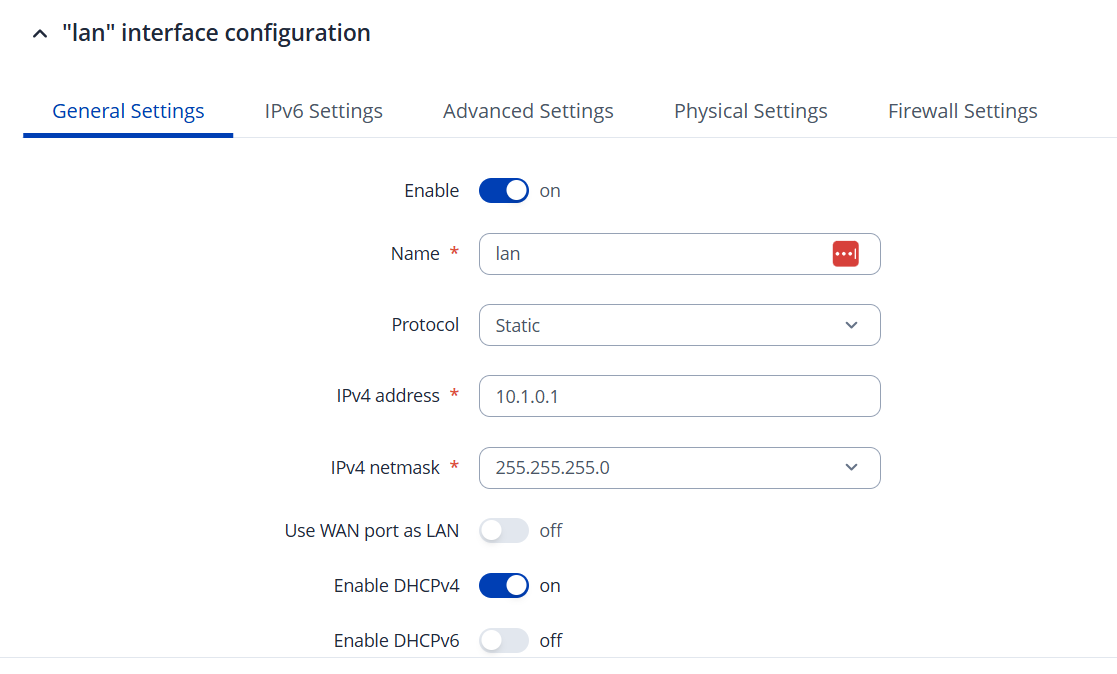 Interface is starting or ethernet cable is not detected as plugged in. Check if port LEDs are lit.” I cannot even ping the 10.1.0.75…Given that lan1 is eth0 I set as eth1 the lan2, after having disactivated eth1 as interface of wan interfaces… the routing that i create for lan2 are seen as routing for lan1… can you please tell me why I am not even able to ping between to devices connected via utp cable which are rutx50 and switch? in order for the pinging and tranfer of data between mobile and lan, only the zones need to be configurated or do i need to do some further configuration?