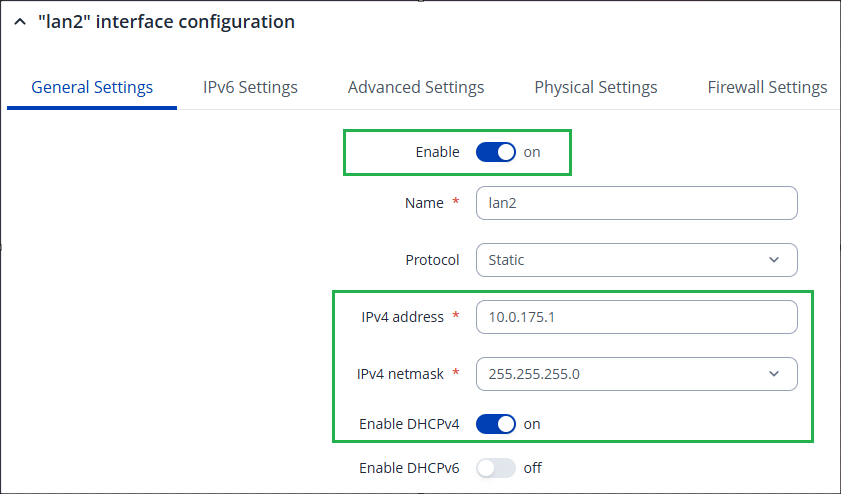 Navigate to the “Network → LAN” menu, and create a new LAN interface. Specify its IP address to be from the desired 10.0.175.0/24 network. Optionally enable DHCP. Example: