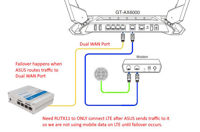 I’d need a bit more clarification regarding your failover case. You say that you want the ASUS to control the failover, so would I be correct if I said that the ASUS sources internet from both the RUTX11 and the modem seen in the topology, and basically switches between them? Regarding that part, we have no expertise with the ASUS modem, so it’ll be hard to give you a good answer.