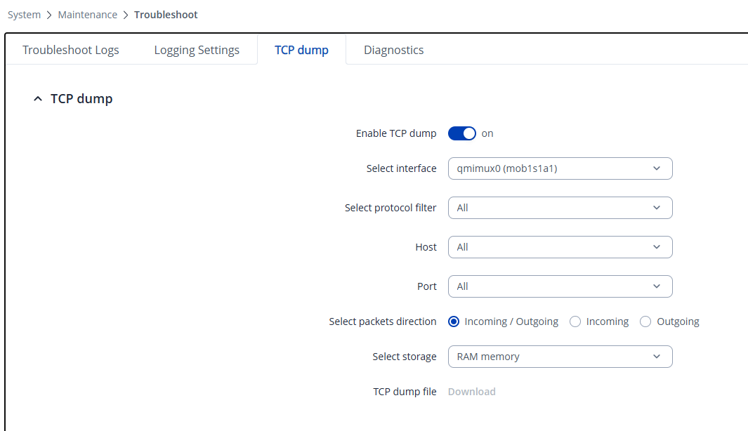 System → Maintenance → Troubleshoot → TCP Dump and configure the capture as shown in the screenshot.