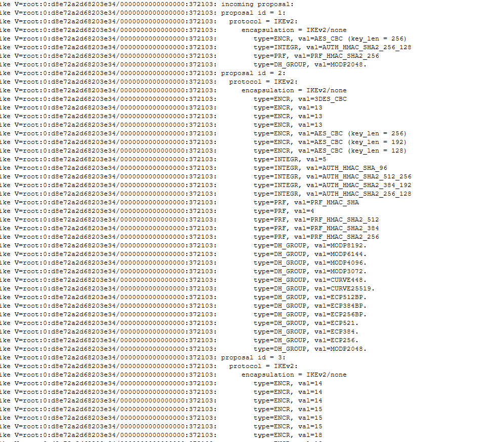 Hello, we have 2 IPSec IKEv2 tunnels configured in RUT241 (running RUT2M_R_00.07.17.1). The tunnels are working fine, but after a week, the RUT is starting to propose different encryption algorithms and PSK. As an example here we have only 1 proposal