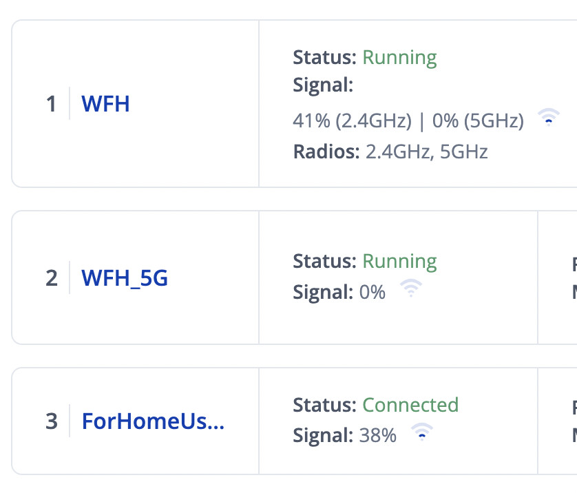 First SSID is on both radios, second is 5Ghz only and third is a client connection back onto house wifi.