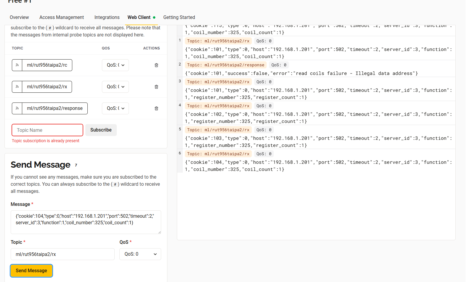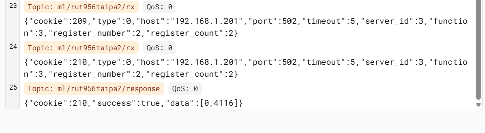I have also turned on the MODBUS MQTT gateway connecting to the same MQTT broker but listening to the /rx topic and responding on the /response topic.