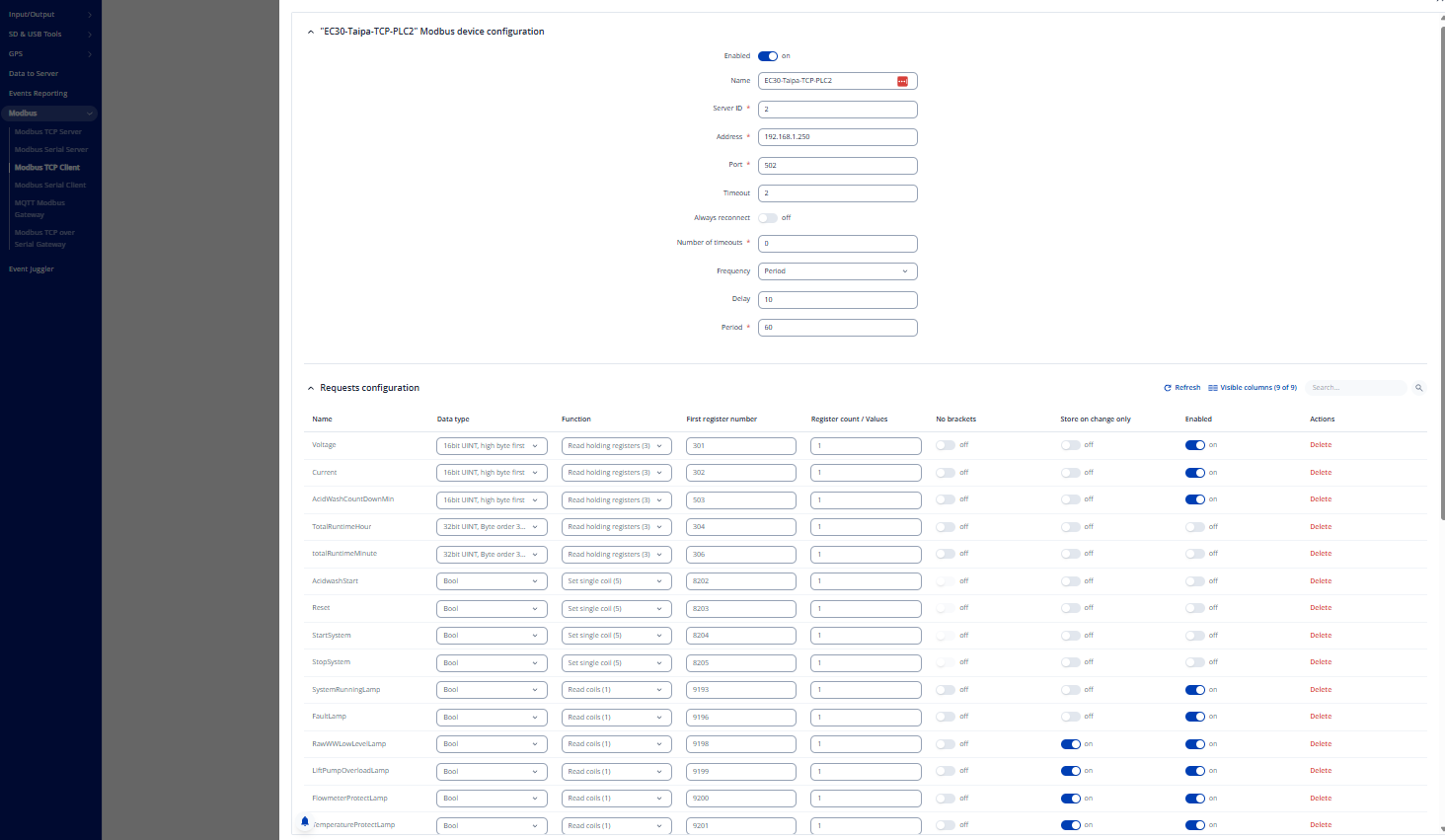 - Modbus TCP Client setup on RUT956 with RUT9M_R_00.07.17.5 software to quert the PLC registers. Manual testing in Modbus TCP Client works correctly and all values return results.