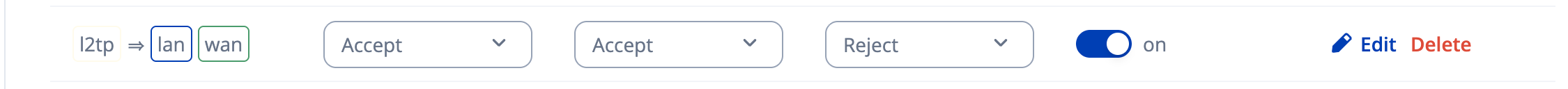 Looking at the rules, it looks like it has automatically created a zone called “l2tp” and that has accept towards the “lan” and “wan” zone