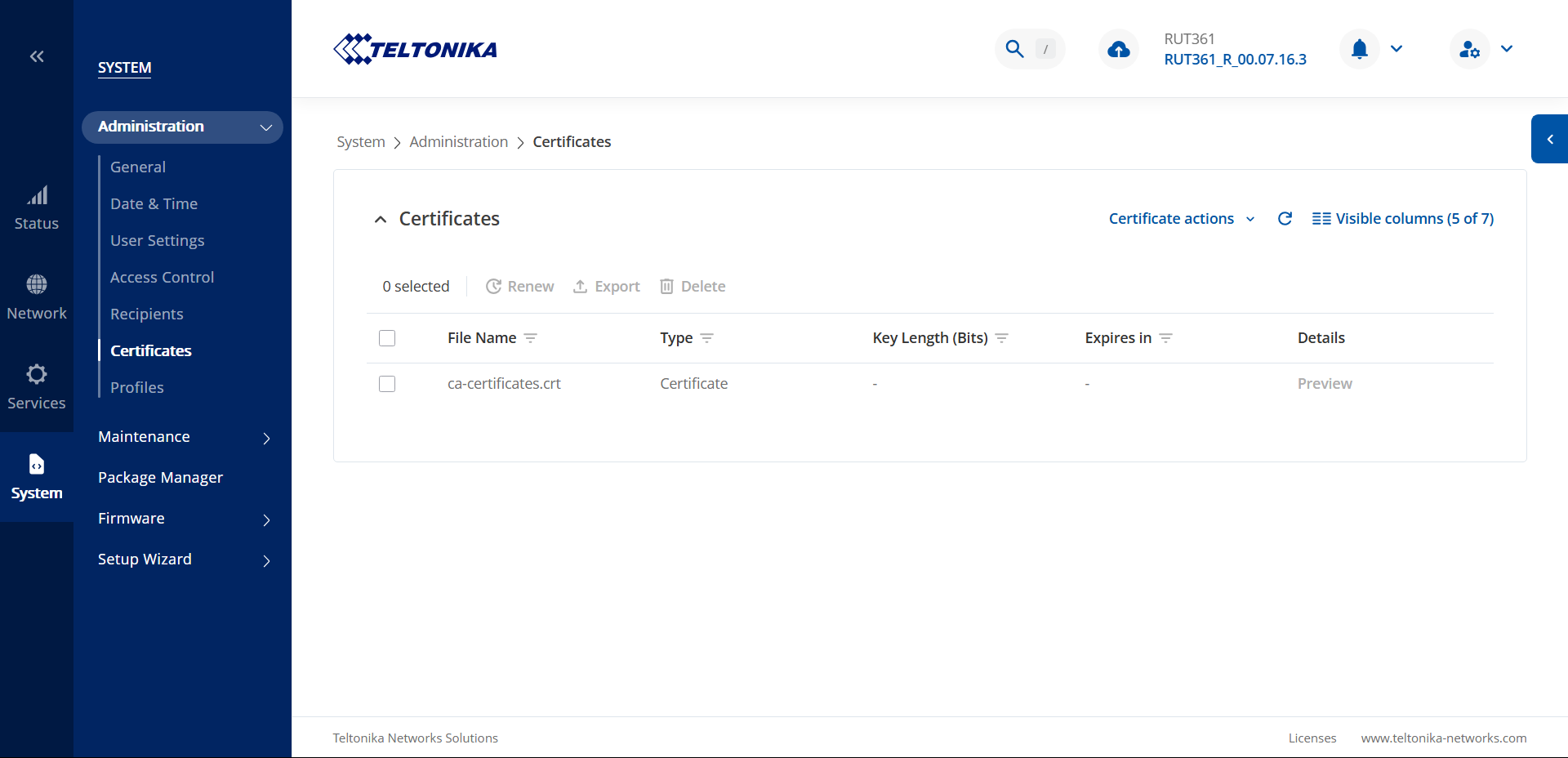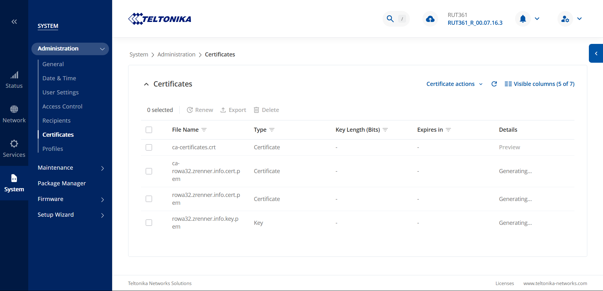 You can also do this live, by connecting to the device via ssh, or go to the device’s CLI in System → Maintenantce, and run logread -f command after connecting to the router. On another browser tab you can open another WEBUI instance, and there generate the certificates, which in another tab you will be able to see live how the device is behaving when generating certificates.