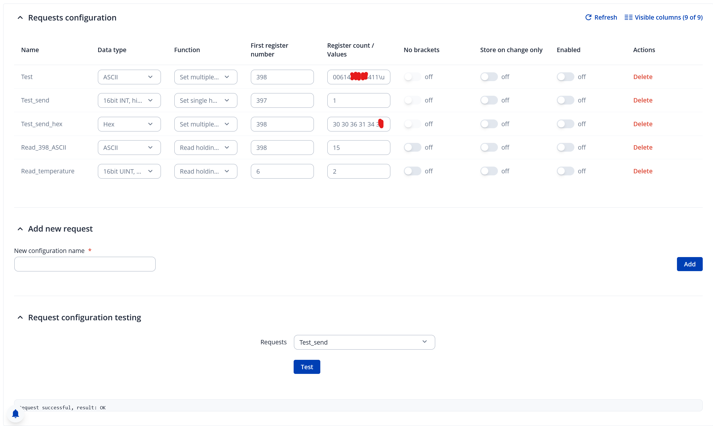 I can write to registers starting from 398 and read from them. (I have changed 5 digits to XXXXX to show that all 10 values for the phone number are being set.