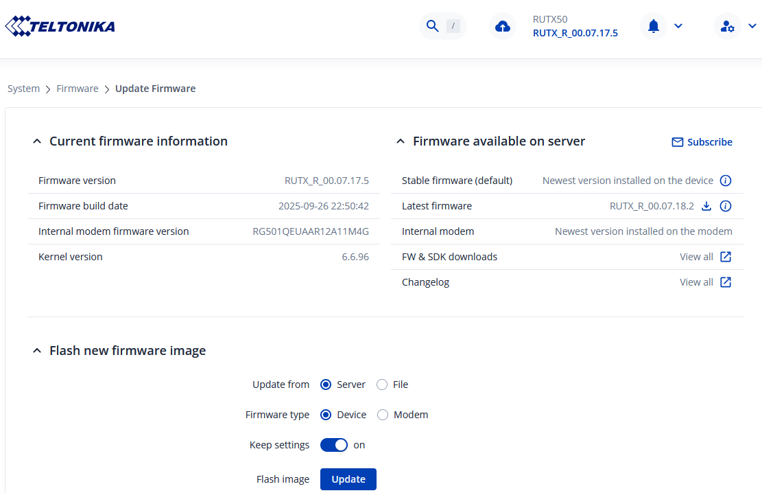 Lastly, to mention, your RUTX is currently running a slightly outdated firmware version and it’s strongly recommended to update to the latest stable (7.18.3) or latest available (7.19.1) RUTOS firmware that has latest bug fixes included for the optimal and smooth operation.