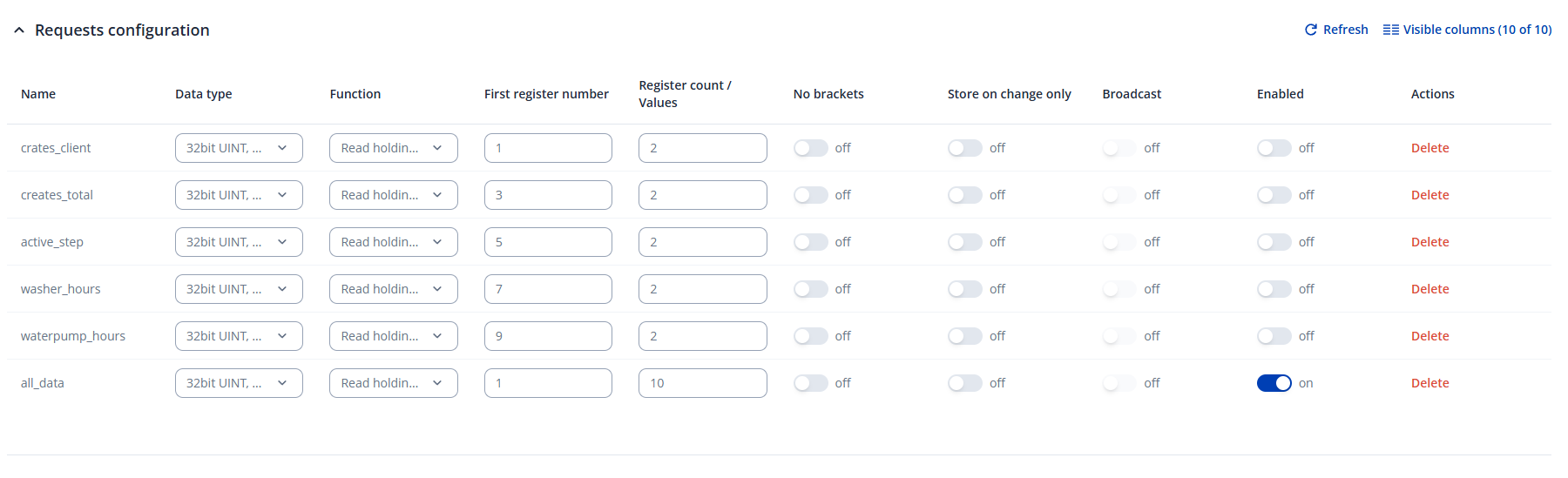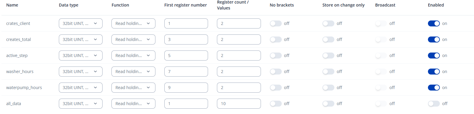 The PLC stores 5 32-bit INT values in its register. They are stored in address 1 to 10. When I request all of them at once, I get the 5 values as expected.