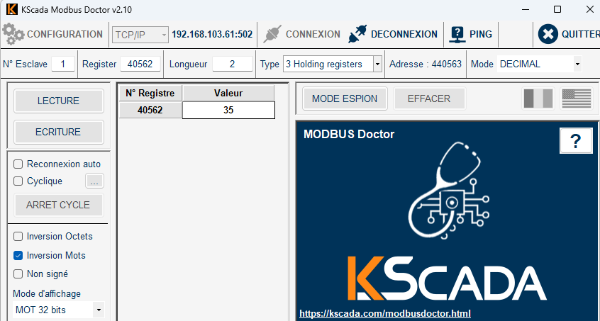 Reading Holding register 40562 (2 length) on a 32bit INT ok on Modbus Doctor