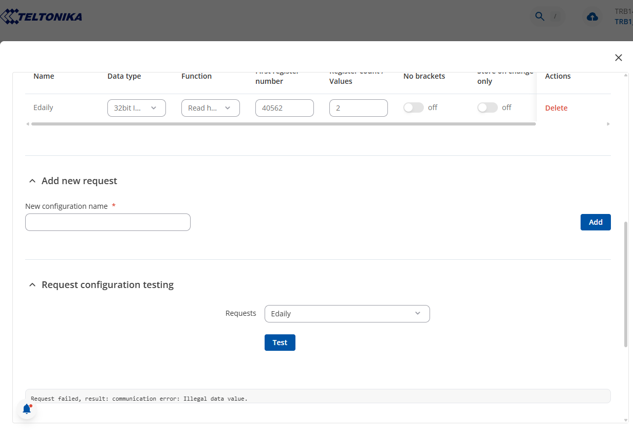 “Request failed, result: communication error: Illegal data value.”