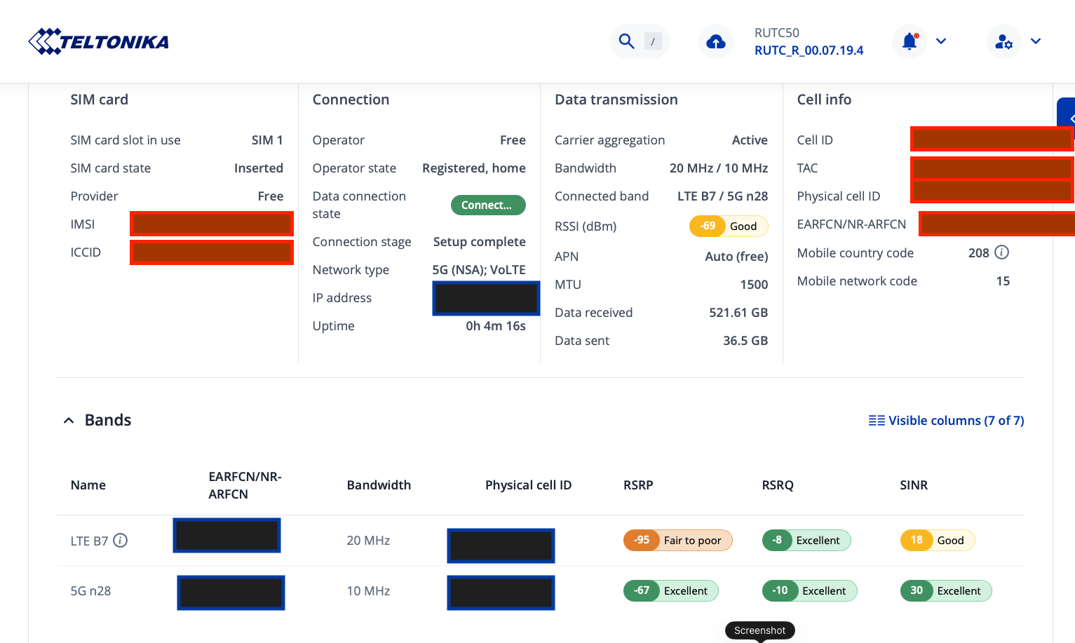 also something seems weird; as you can see in the screenshot below 5G N28 should be the better cell but the modem is connected to LTE B7. and it is set as primary by RUTOS Why is that please ? There is no option to set the primary to 5G N28