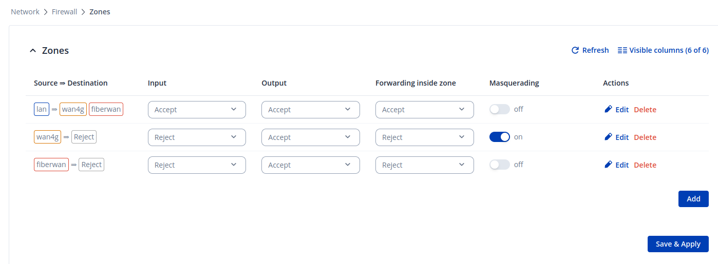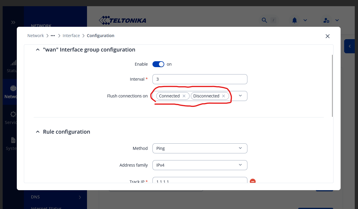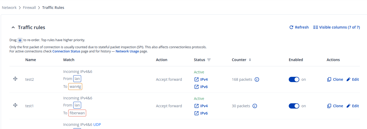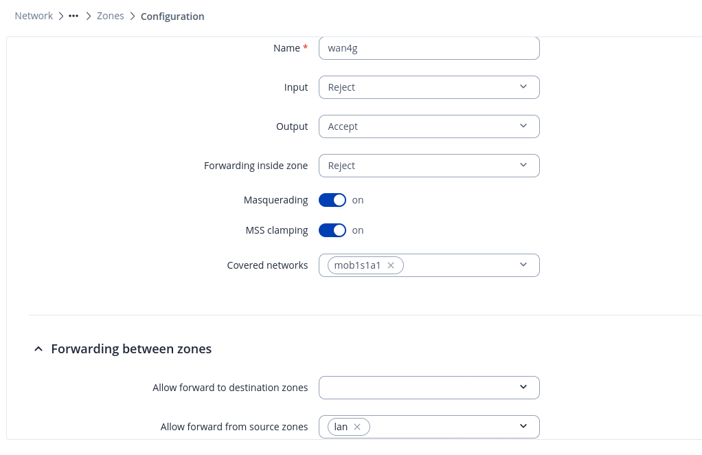 There’s another firewall in front of Teltonika, and instead of writing rules on Teltonika for source IPs, I want to write rules on the firewall in front of Teltonika. I created two firewall zones; in one, 4G WAN Masquerading is enabled, and in the other zone, fiber WAN Masquerading is disabled. However, when I disconnect the cable for testing, it switches to 4G, but there’s no traffic.