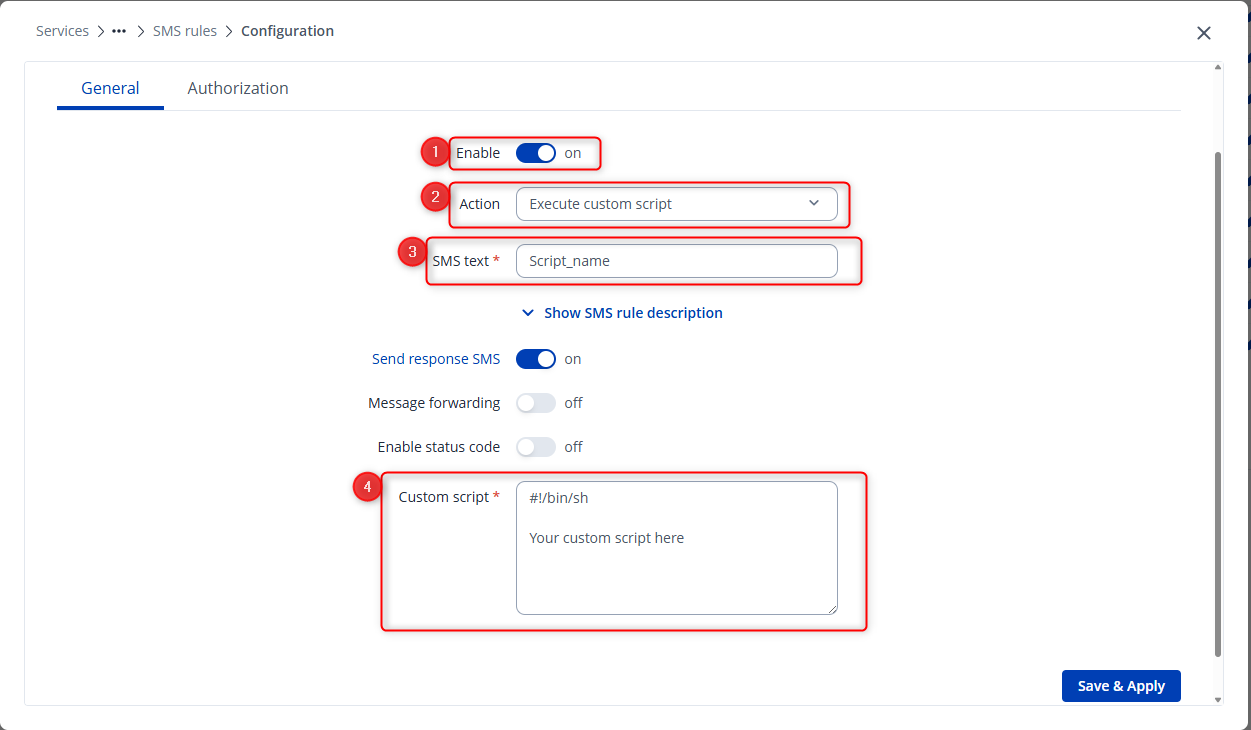 You can execute a custom script through SMS commands by creating a custom SMS rule. To do this, navigate to Services → Mobile Utilities, scroll to the bottom, and click “Add.” In the configuration window, set the Action to “Execute custom script.” In the SMS text field, enter the text that will trigger the command (for example, <router_password> Script_name), and in the custom script field, insert your desired script. This configuration ensures that sending the specified SMS will execute your custom script.
