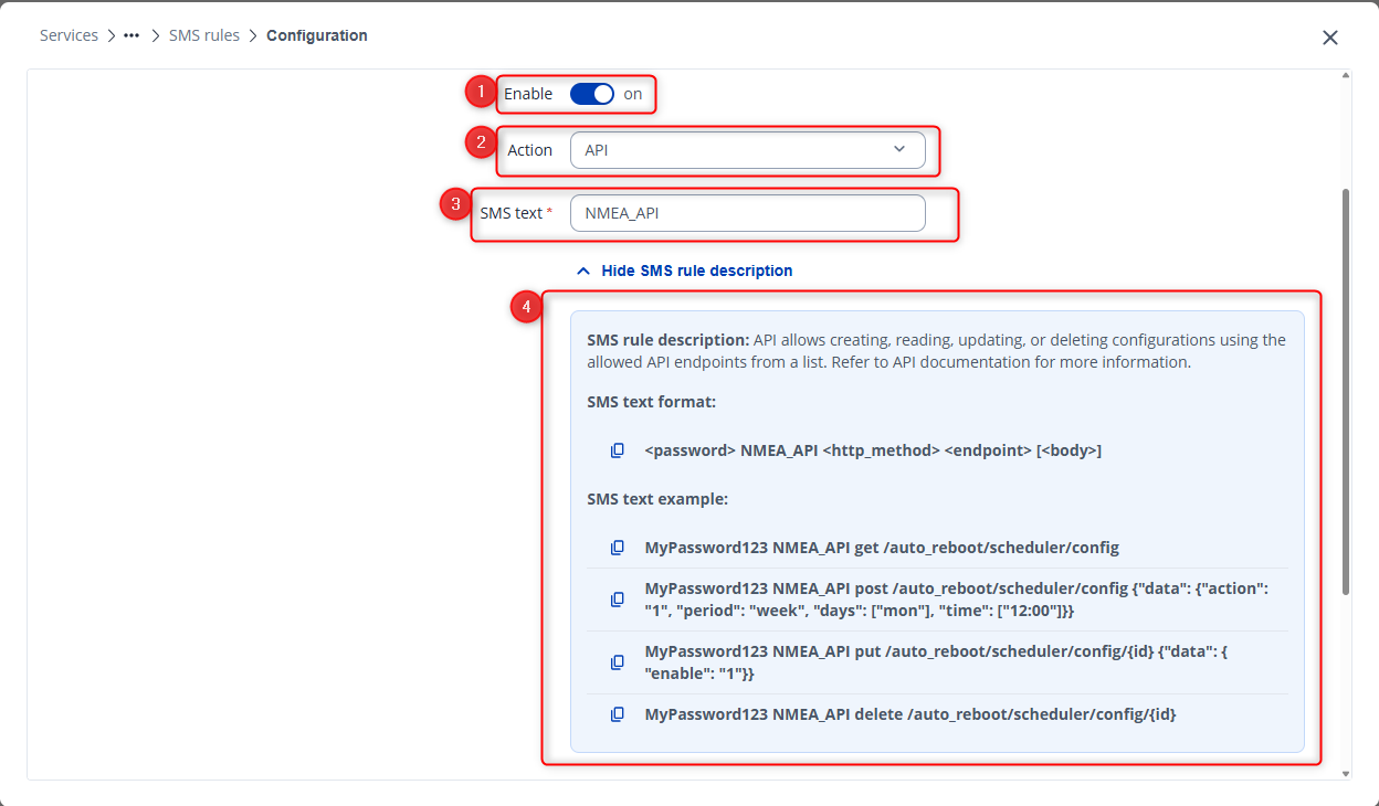 Additionally, you can enable or disable NMEA collecting rules using an API endpoint. In the Action field, choose “API,” define the SMS text, and follow the syntax shown in the example below:
