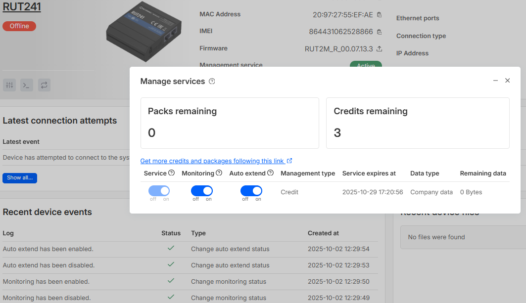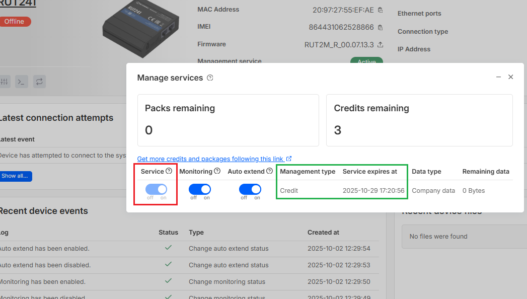 Credit is activated when you enable the “Service” in this menu. Then in the “Management type” and “Service expires at” fields, you can see that Credit is activated and when it will expire.