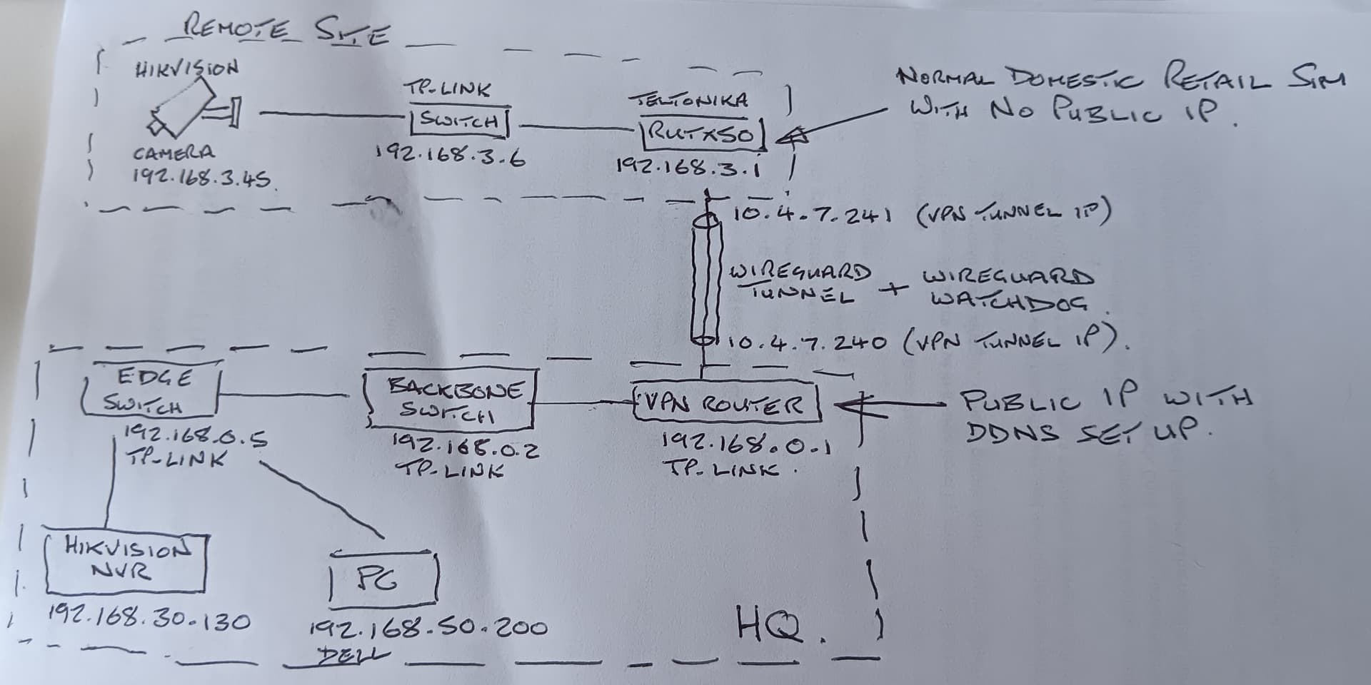 Basic topology below, and note that the HQ has different subnets and VLAN’s involved so, not a ‘plain vanilla’ network topology. If using Wireguard, probably most head-scratching will be around understanding the network topology at the NVR end.