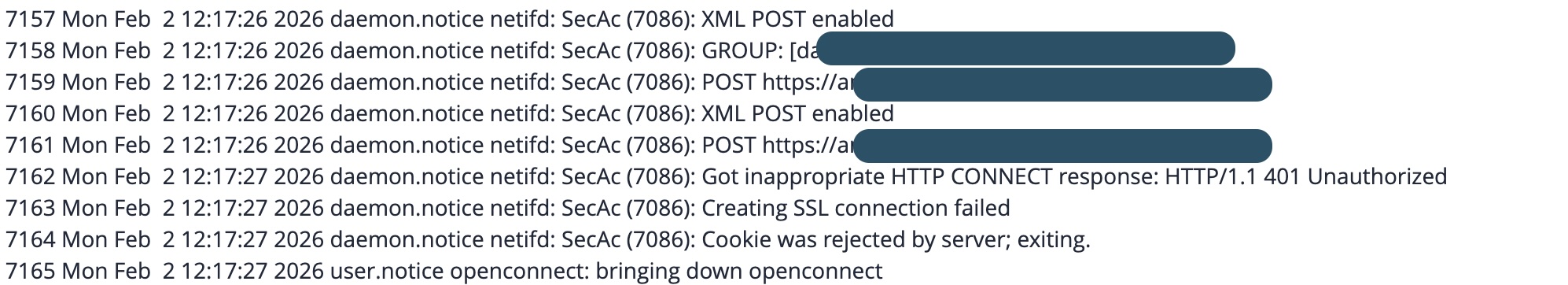 Hi @Matas - basically error message is as described in the discussion link in the original post where the ‘fix’ was an updated OpenConnect package. The ‘Cookie was rejected by server’ error pointing to how OpenConnect presents itself as an AnyConnect client……the OpenConnect update providing an update to this mechanism.