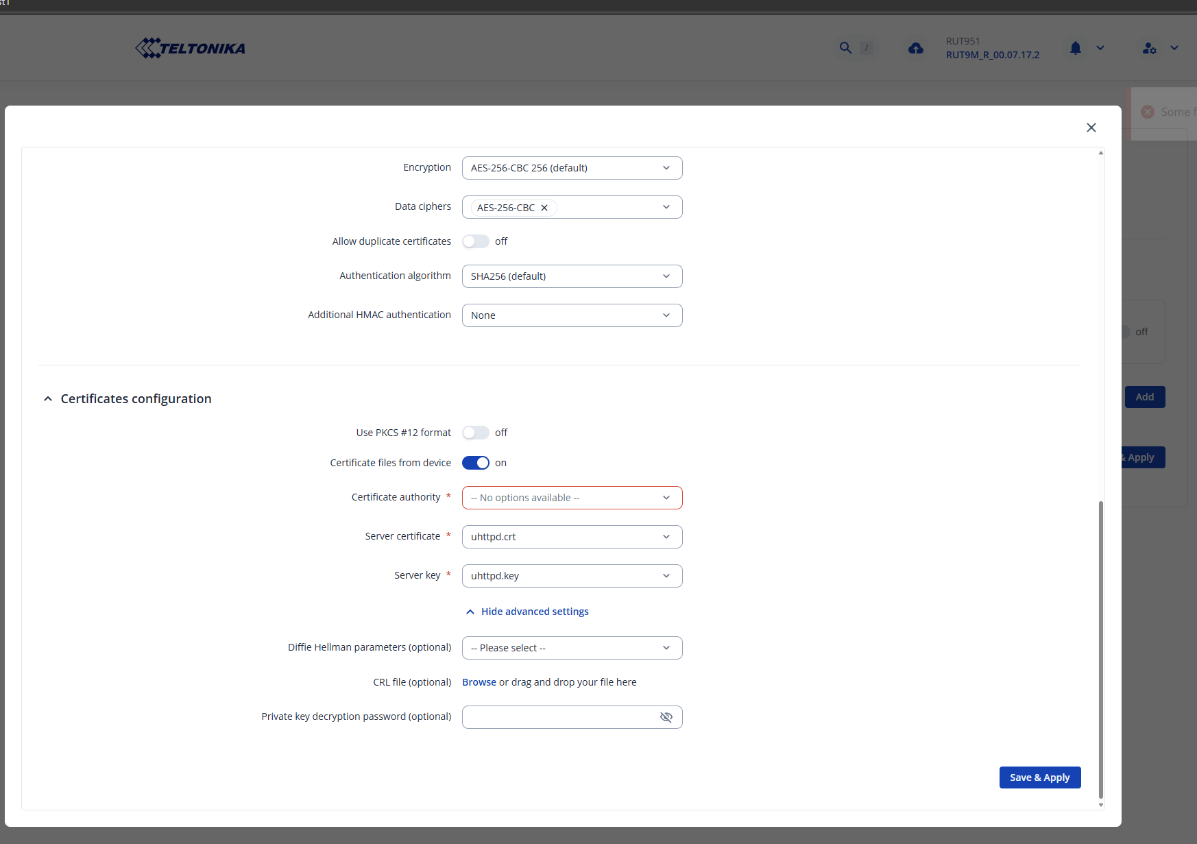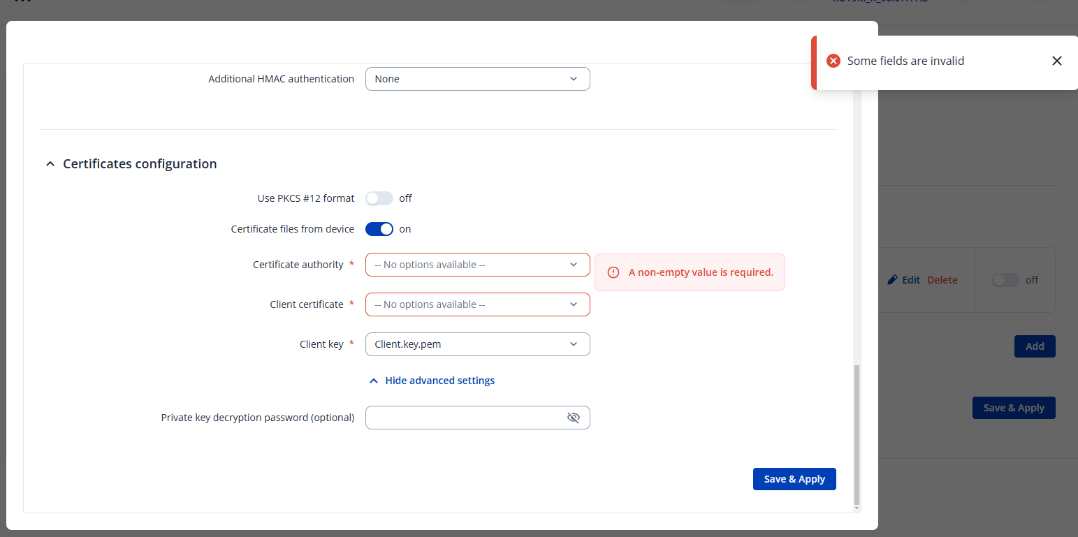 It seems like none of your certificates that you’ve chosen are correct, and the missing certificate hasn’t been generated by you yet. Since you’re doing an OpenVPN configuration, I strongly suggest following this guide: OpenVPN configuration examples - Teltonika Networks Wiki