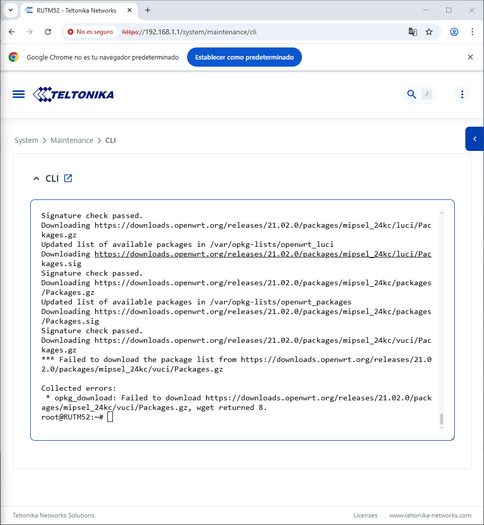I am currently trying to install iperf3 package on my RUTM52. However, I have encountered that after running the opkg install iperf3 command, the response was Unknown package ‘iperf3’ Package installation encountered an error, removing previously installed package, so I decided to follow the commands indicated in the following issue: