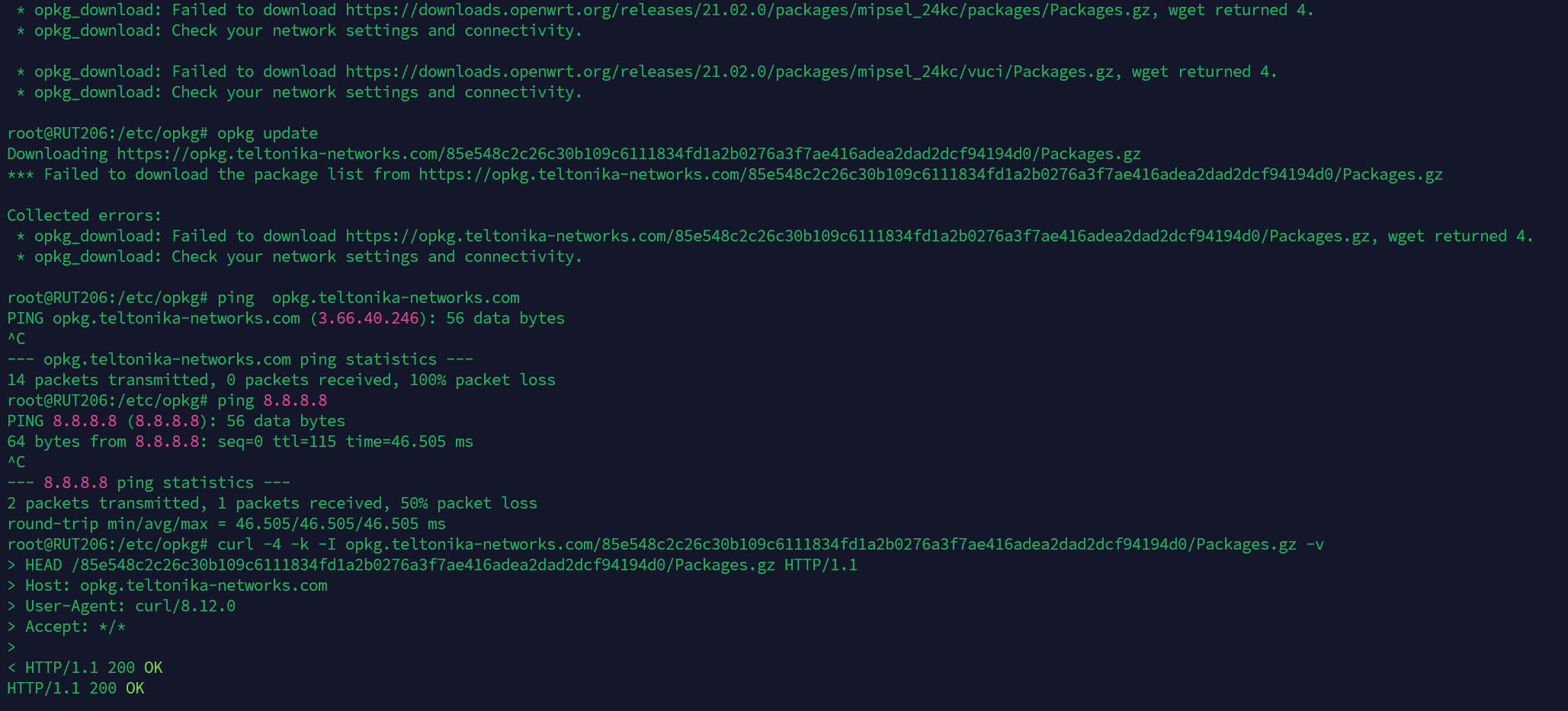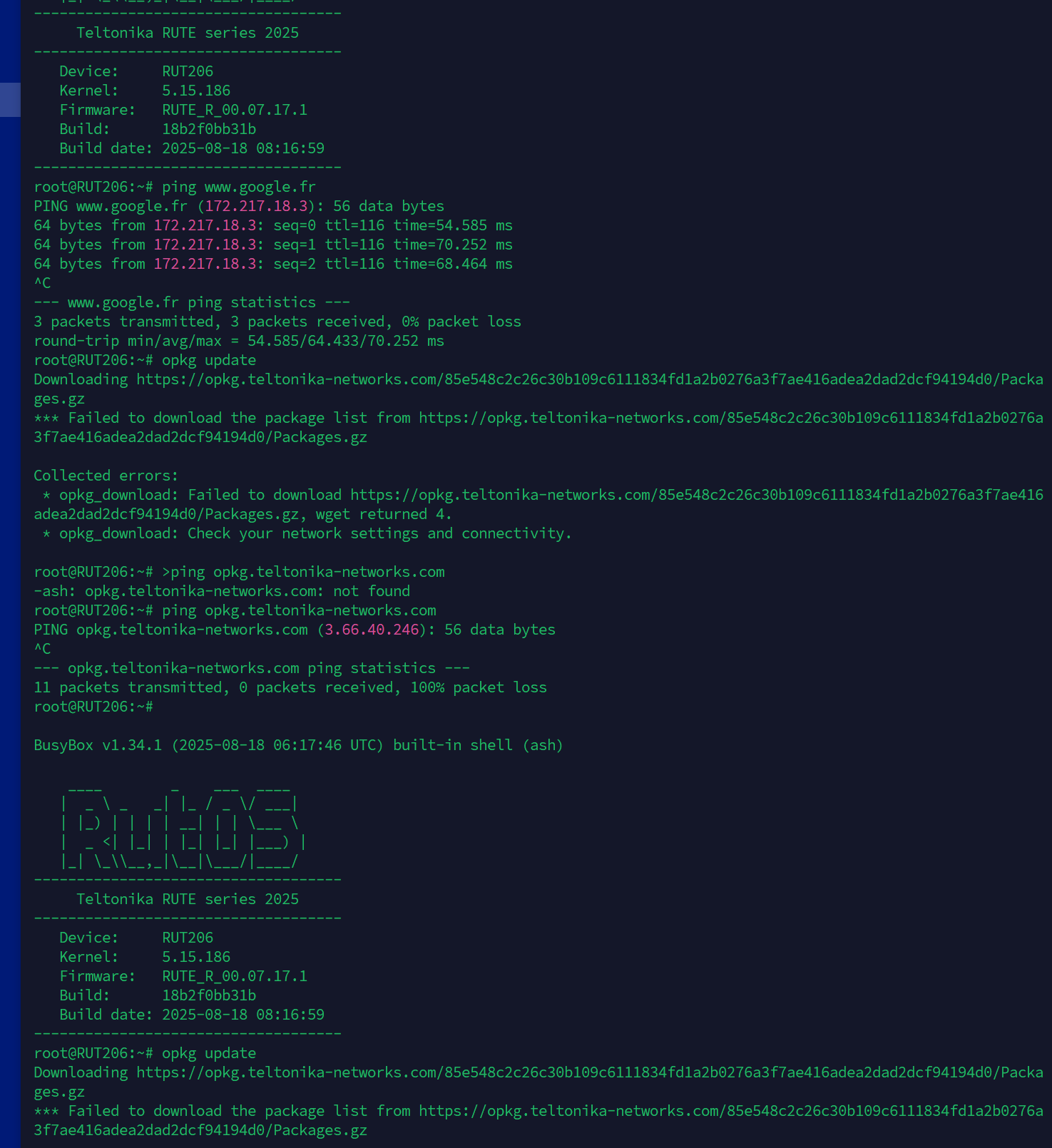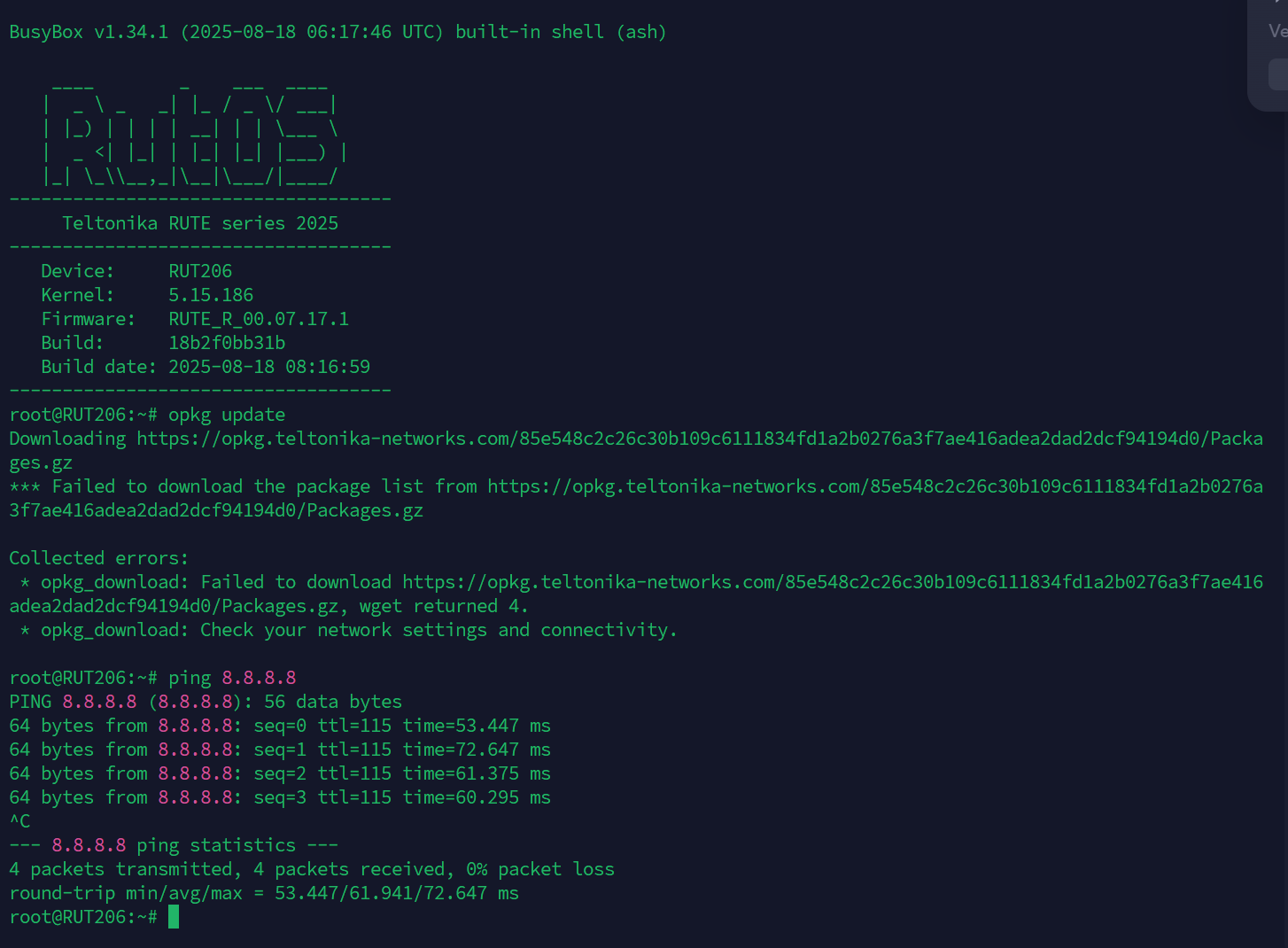 I want to update opkg from RUT206 FW 7.17.1, but there are a problem to wget also on teltonikefeeds and openwrt.
