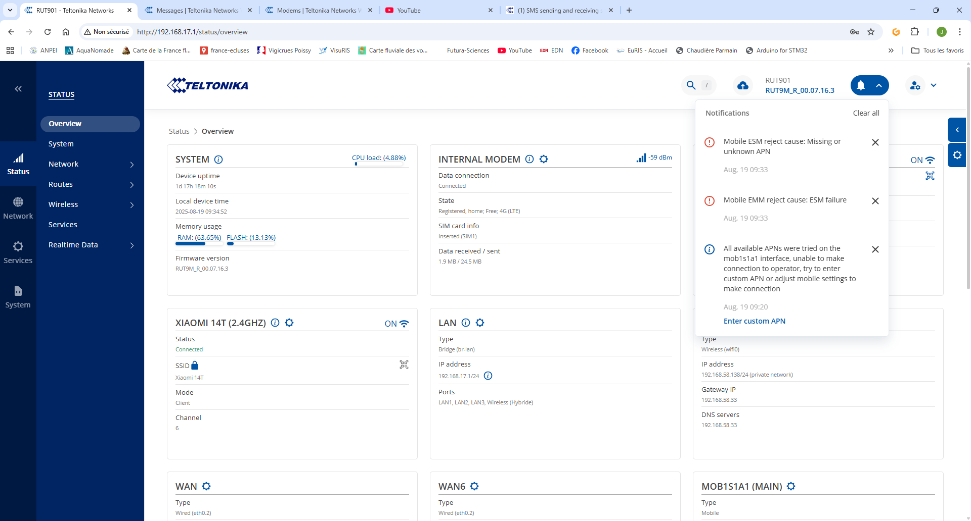 When I look at the WEBUI, I get continual error notifications, that may be relative to the bad behavior of the RUT901.